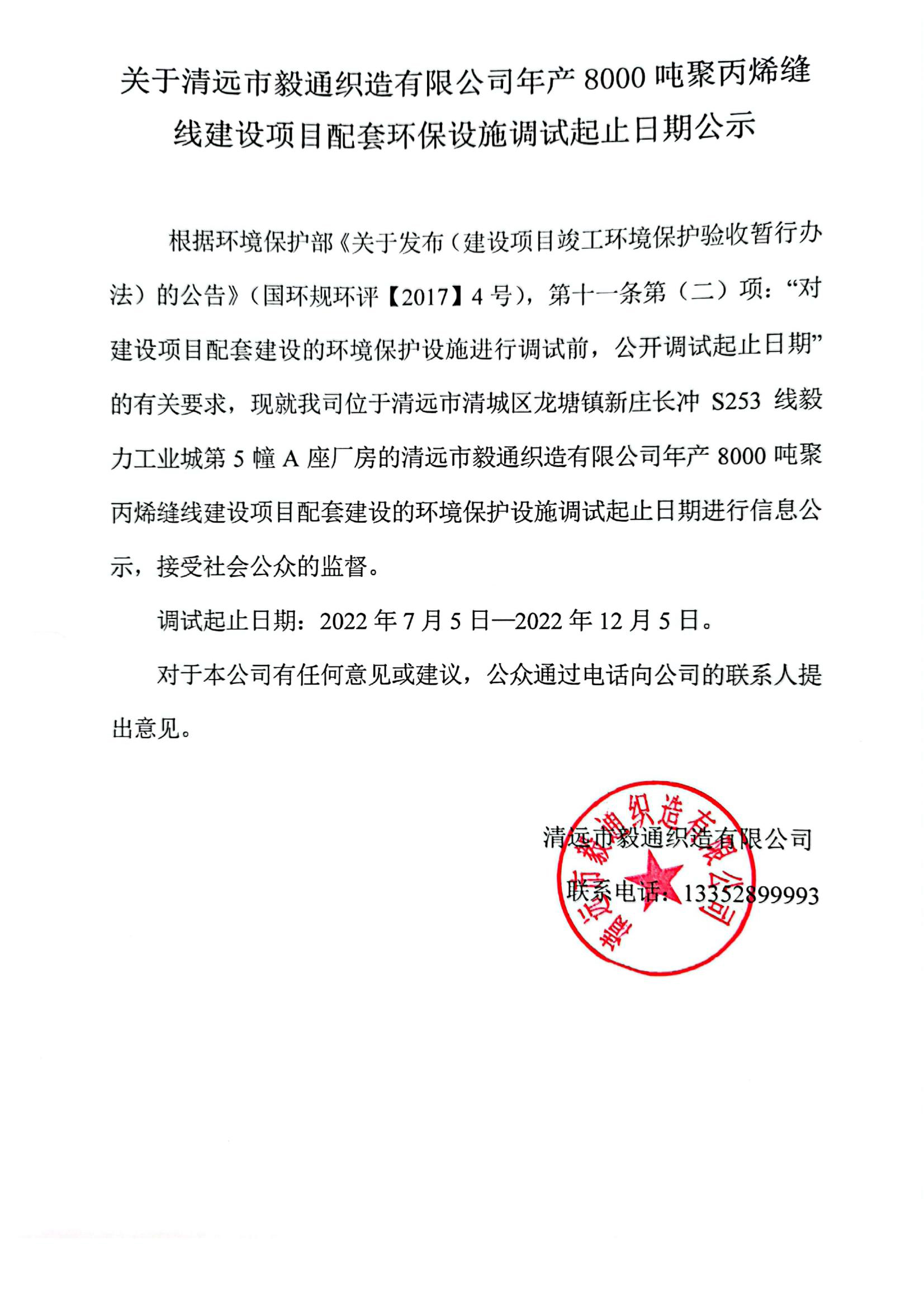 下一頁: 關于清遠市毅通織造有限公司年產8000噸聚丙烯縫線建設項目配套環(huán)保設施竣工...
